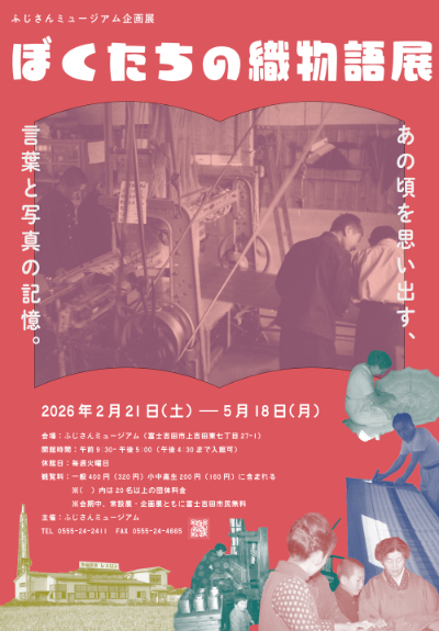 本展は、2023年開催の「FUJI TEXTILE WEEK 2023」のデザイン展「甲斐絹をよむ」、2024年ふじさんミュージアム企画展「甲斐絹をよむ #2」に続く、第3弾の織物に関する企画展です。Fuji Archive Projectを主宰する馬場亮河氏(富士吉田市地域おこし協力隊)に展示協力いただき、ふじさんミュージアム企画展として開催します。